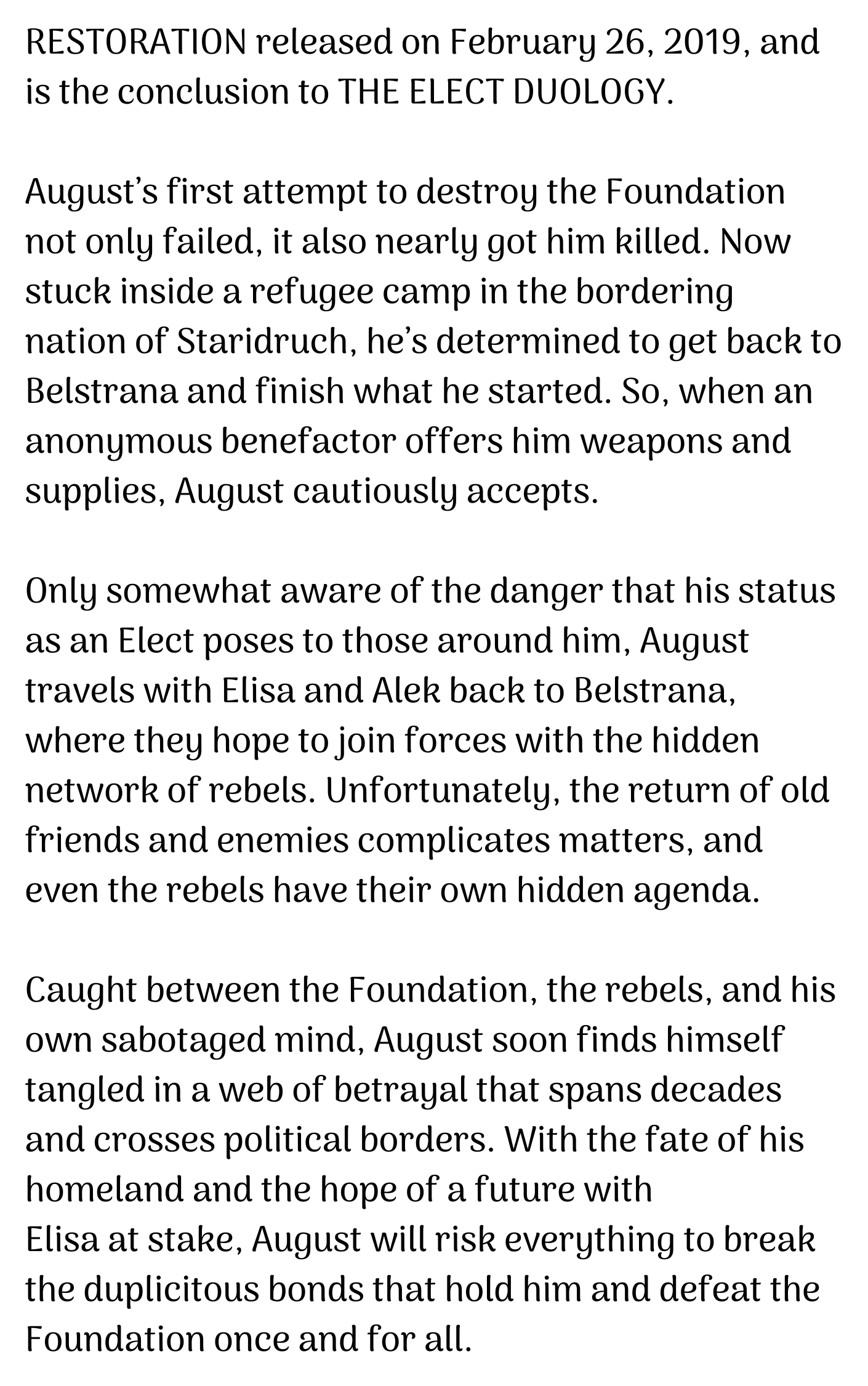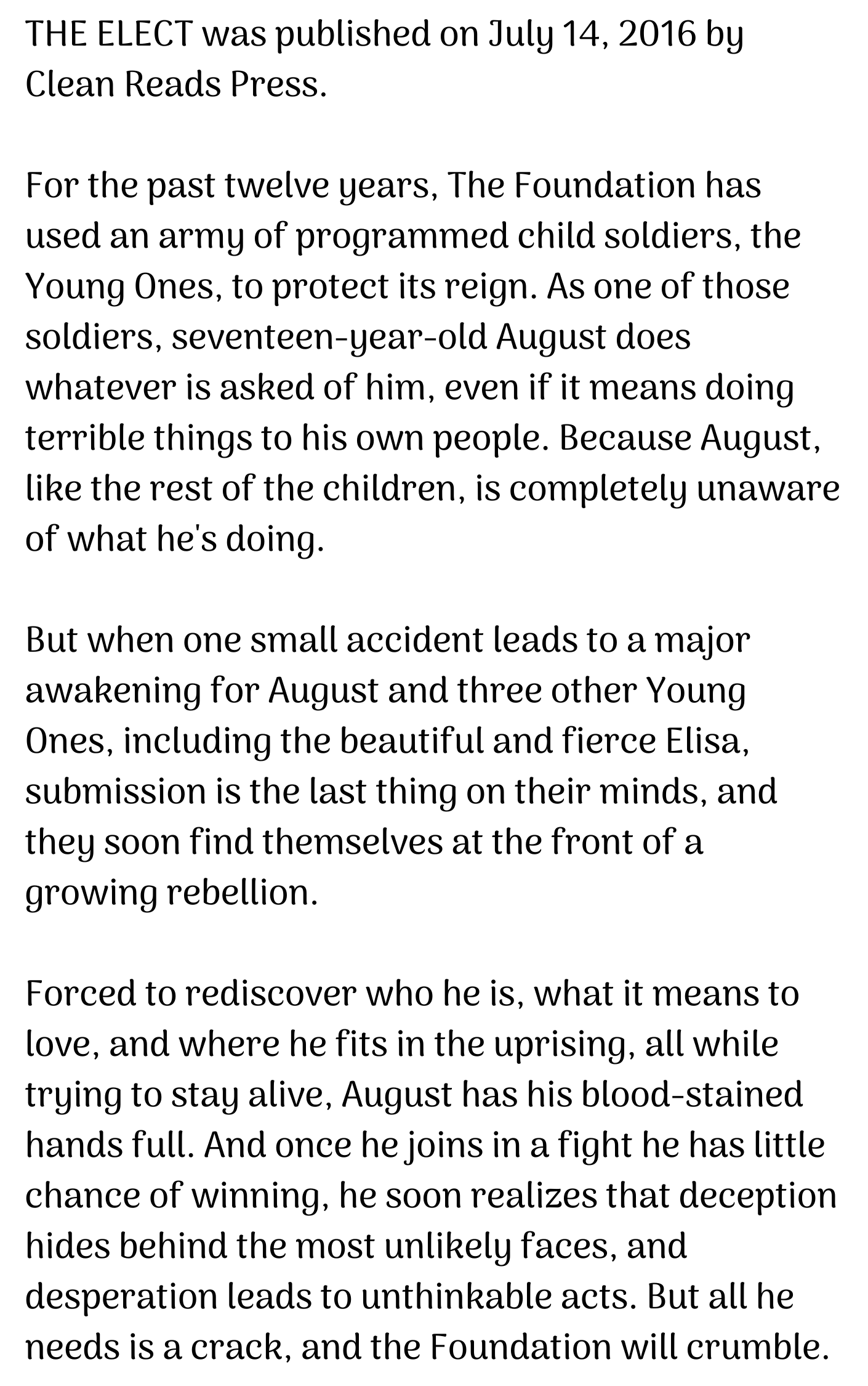 You can purchase THE ELECT from Bookshop.org, Amazon, Barnes and Noble, and Audible. You can read for free with a Kindle Unlimited membership. 2022 UPDATE: This publisher went out of business during the pandemic, and I am currently exploring options for re-releasing this book. Stay tuned!